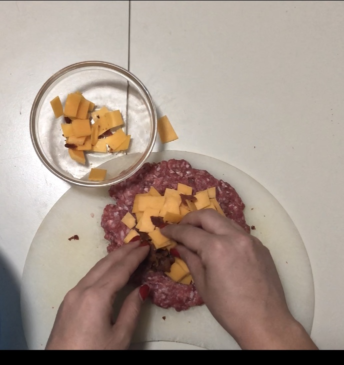2. Cuocere 2 fette di bacon in una padella molto calda per pochi minuti e poi tagliarlo a pezzettini. Tagliare a pezzettini anche il formaggio, io ho usato il cheddar ma voi potete usare quello che più preferite, e mettete il tutto sopra uno dei due hamburger. Usare poi l'altro hamburger per sigillare il tutto e cuocere nella stessa padella del bacon!