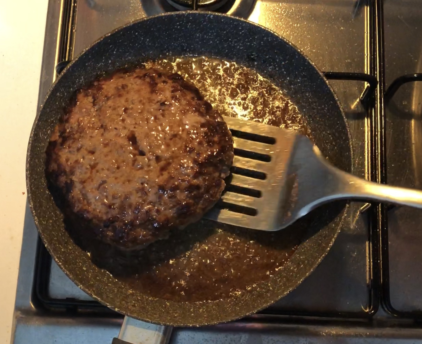 3. Dopo aver cotto l'hamburger poggiateci sopra altre due fette di cheddar e coprire la padella con un coperchio per far sciogliere il formaggio. Sempre nella stessa padella dopo averla pulita semplicemente con un po di scottex, fate cuocere l'uovo all'occhio di bue.